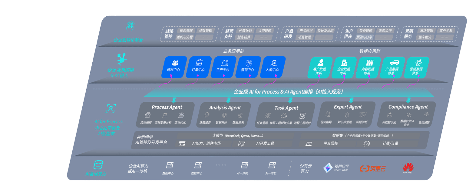 端到端的一站式AI工作空间深度融合了从企业战略规划到日常经营的全流程业务板块,,,定向解决车企内部领域多、、、部门多、、、链条长、、、场景碎片化等难题,,支持车企快速构建以AI为核心的生产力写作体系,,,实现任务执行与AI能力的无缝集成与交互
