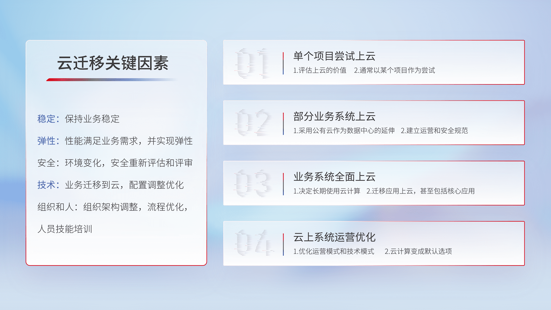 结合实际业务,,,,从规划设计、、、、云平台选型、、云原生改造、、数据迁移、、、、集成交付,,迁移全过程为客户识别最佳上云路径,,做好风险识别管理,,,设计网络架构、、、身份权限、、、安全审计合规、、、、操作审计、、、、日志审计、、、、监控告警策略、、多站点容灾设计等,,对云上基础设施进行整体规划,,,,提升IT治理水平,,以满足弹性、、高可用、、高性能的需求。。。