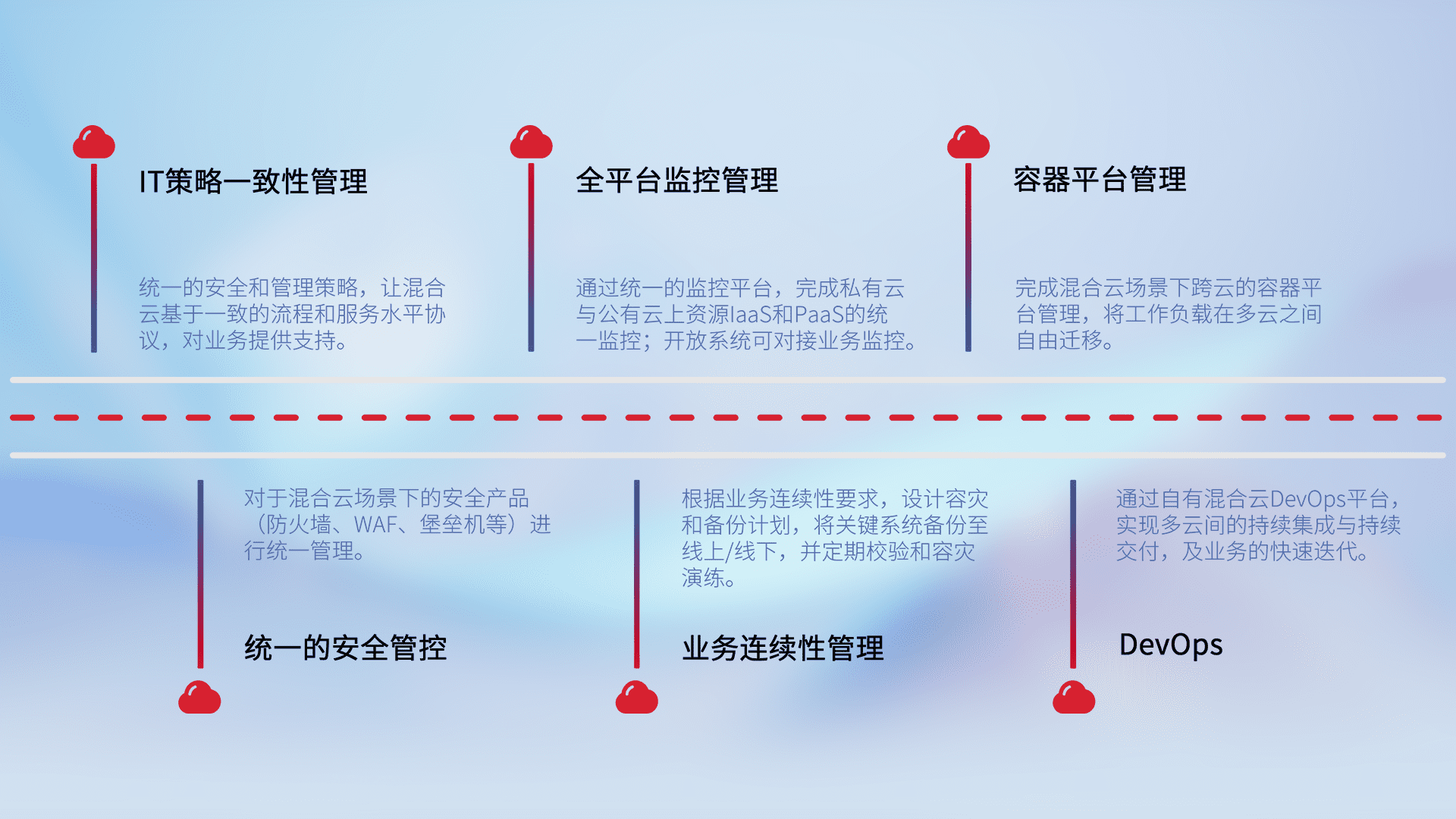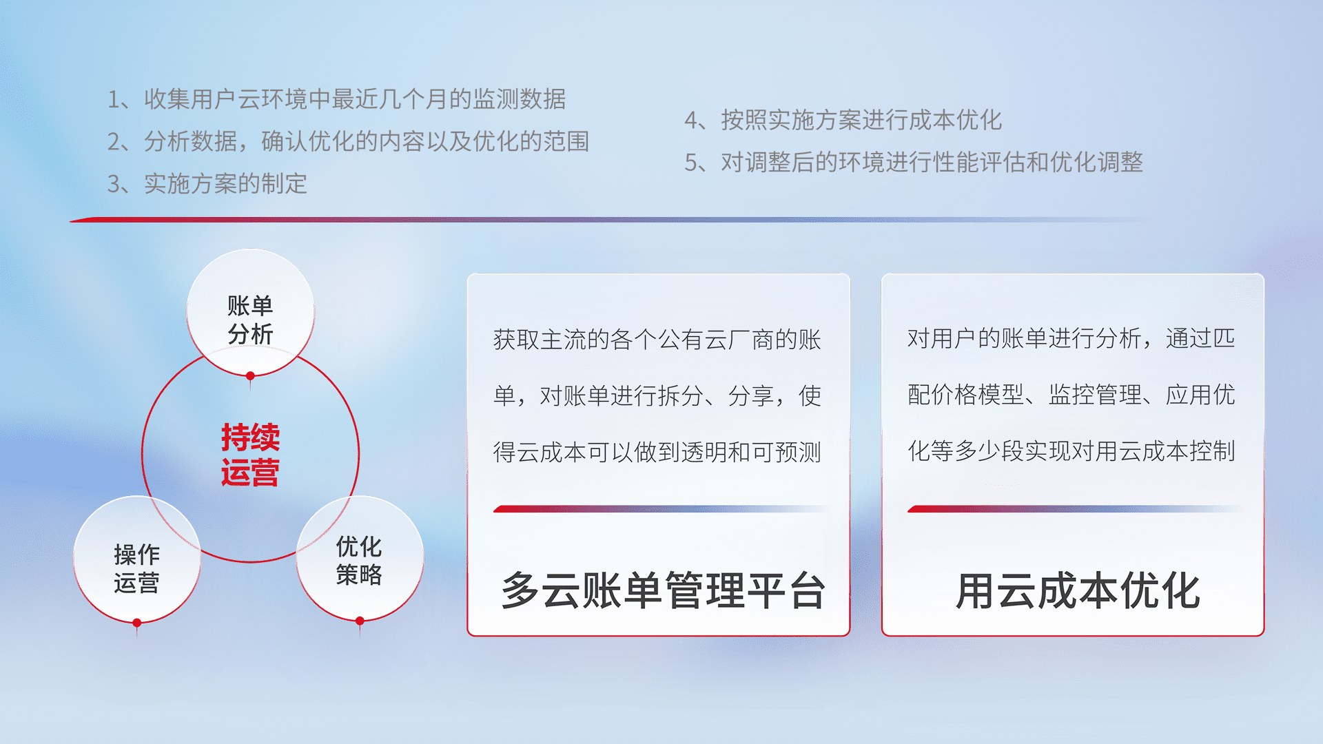 通过多云纳管,,,以统一的资源数据模型把客户的云资源进行抽象和封装,,,,进而实现对多云资源的统一操作,,保障云资源管理的可靠性、、、稳定性与可用性。。。。量身定制化运维内容,,配置、、开发运维、、、补丁管理、、备份、、监控、、、、认证和访问管理、、、、审计和日常巡检等,,,,保障在用云过程中的可靠度,,,稳定度以及高可用率。。。。