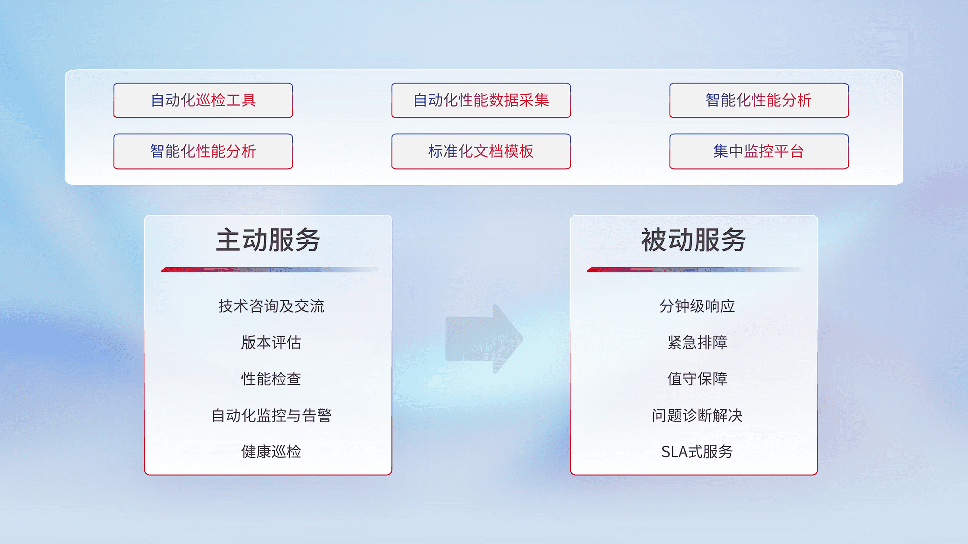 智能化工具和标准化文档,,,,保障服务质量,,,提供主动服务(包含技术咨询、、、、版本评估、、、、性能检查、、自动化监控与告警、、、、健康巡检)和被动服务包含(分钟级响应、、紧急排障、、、值守保障、、、、问题诊断解决、、SLA服务)。。。。